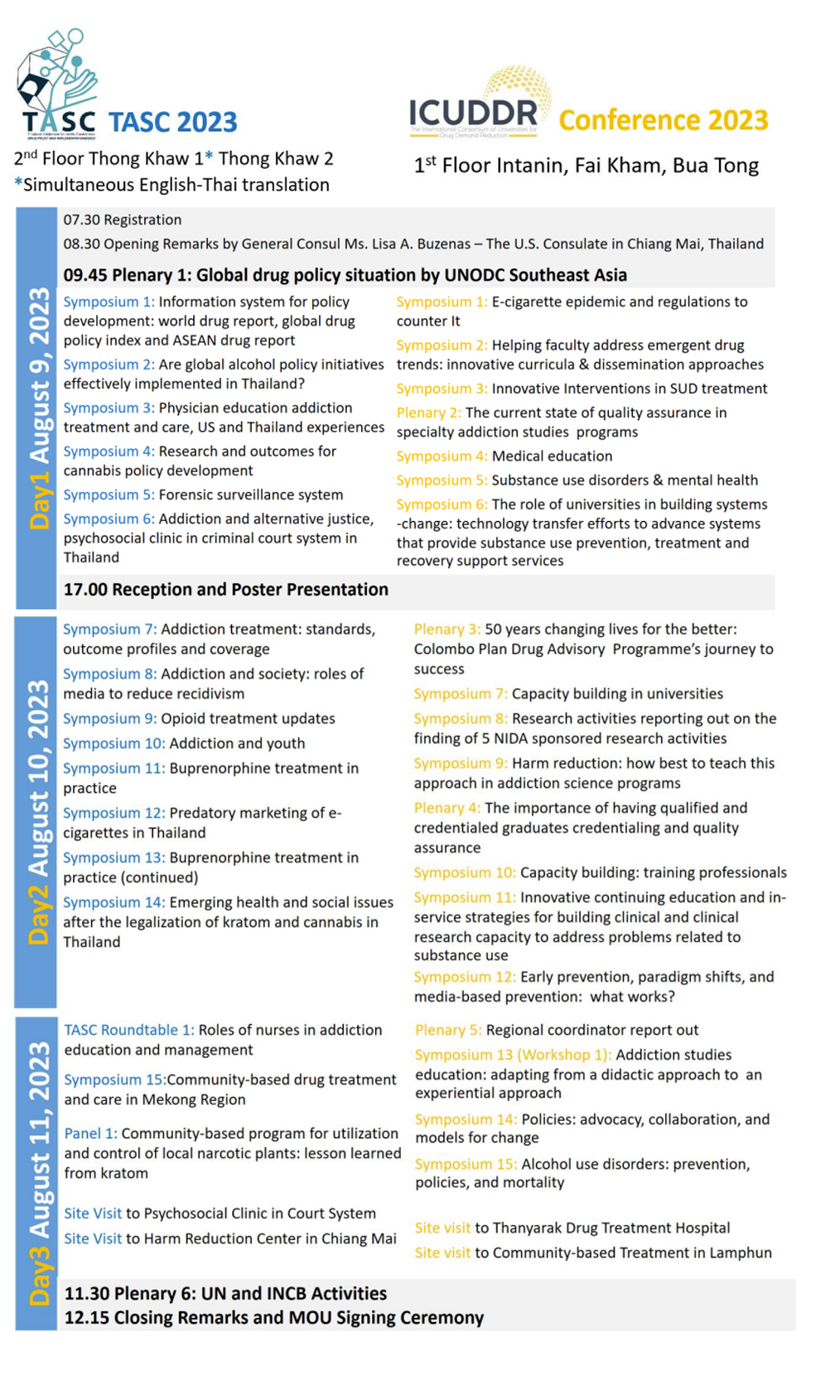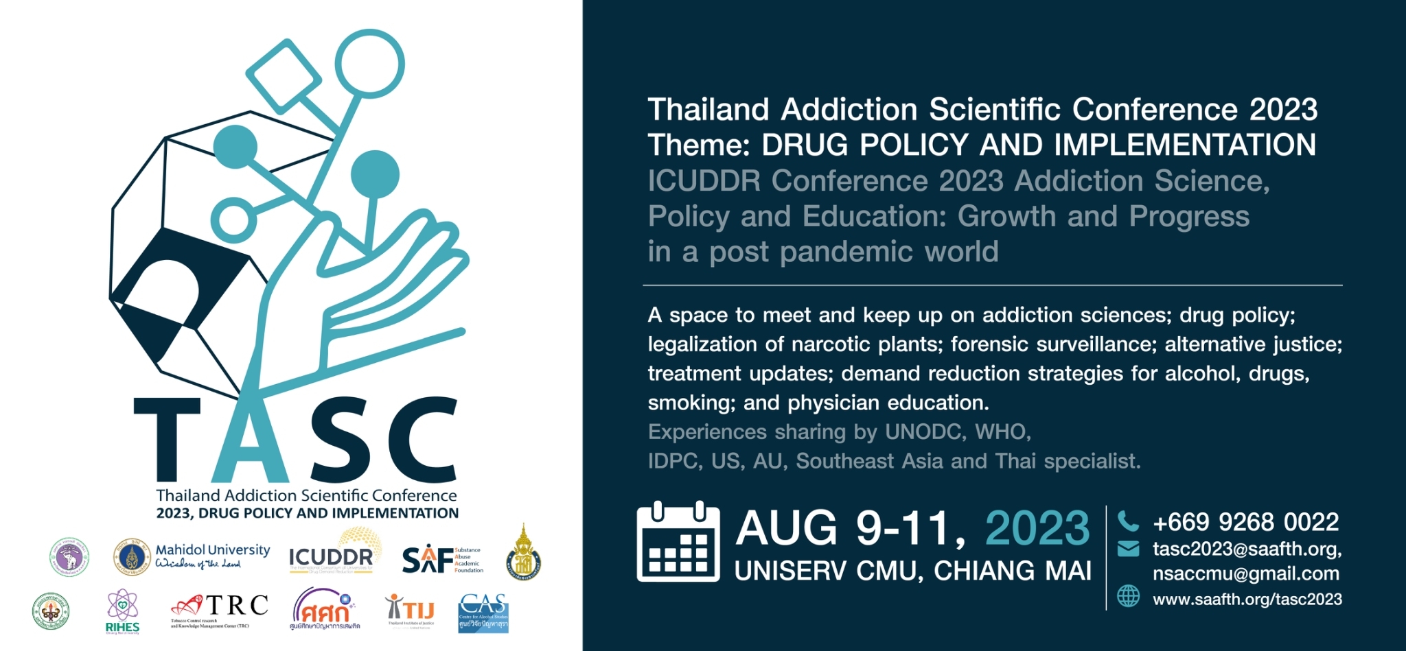 TASC 2023 joint with ICUDDR Conference 2023 is a place and time for substance abuse scholars, researchers, addiction practitioners, drug policy implementers, players in healthcare-justice-education systems, and civil society to meet and learn more. This year’s themes are ‘drug policy and implementation’ together with ‘addiction science, policy and education: growth and progress in a post pandemic world’. Highlights include global drug policy; international and regional information system for policy development; emerging health and social issues after the legalization of narcotic plants; forensic surveillance; alternative justice; treatment updates; demand reduction strategies for alcohol, drugs, smoking; and physician education