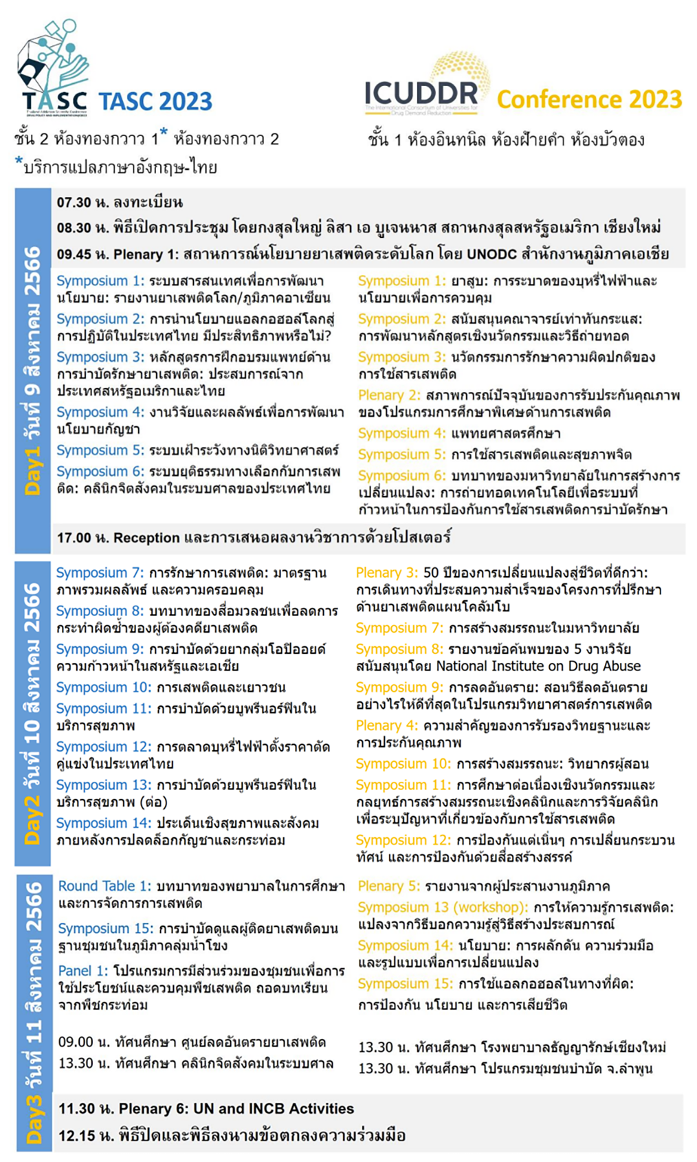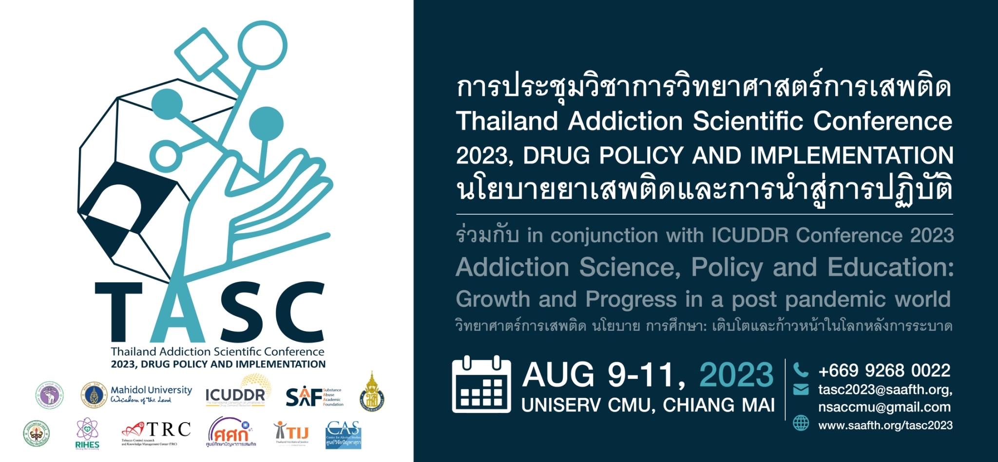 งานประชุมวิชาการวิทยาศาสตร์การเสพติด พ.ศ. 2566 จัดร่วมกับการประชุมประจำปีของสมาคมความร่วมมือทางวิชาการของมหาวิทยาลัยนานาชาติเพื่อลดอุปสงค์ต่อยาเสพติด (ICUDDR Conference 2023) ประเด็นหลักของ TASC 2023 คือ นโยบายยาเสพติดและการนำสู่การปฏิบัติ ประเด็นหลักของ ICUDDR Conference 2023 คือ วิทยาศาสตร์การเสพติด การศึกษา: เติบโตและก้าวหน้าในโลกหลังการระบาด TASC2023 & ICUDDR Conference 2023 เป็นพื้นที่และโอกาสแลกเปลี่ยนเรียนรู้ประสบการณ์ ก้าวทันสถานการณ์การเสพติดทั้งในระดับโลก ภูมิภาคเอเชียตะวันออกเฉียงใต้ และประเทศไทย หัวข้อนำเสนอสำคัญ อาทิ นโยบายยาเสพติดโลก ระบบสารสนเทศเพื่อการพัฒนานโยบายยาเสพติด ประเด็นเชิงสุขภาพและสังคมหลังการทำให้พืชเสพติดถูกกฎหมาย ระบบเฝ้าระวังทางนิติวิทยาศาสตร์ ระบบยุติธรรมทางเลือก การบำบัดรักษา การป้องกัน กลยุทธ์ลดอุปสงค์ของยาเสพติด บุหรี่ แอลกอฮอล์ รวมถึงหลักสูตรเวชศาสตร์การเสพติดในโรงเรียนแพทย์